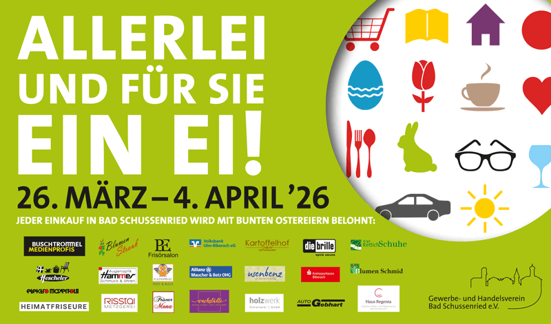 Frühling liegt in der Luft – und Bad Schussenried feiert ihn mit einem großen Familientag mit verkaufsoffenem Sonntag! Am 26. April 2026 verwandelt sich die Innenstadt von 12 bis 17 Uhr in eine bunte Erlebniswelt für Groß und Klein. Der Gewerbe- und Handelsverein lädt gemeinsam mit der Stadt Bad Schussenried zum Schlendern, Staunen, Shoppen und Genießen ein.